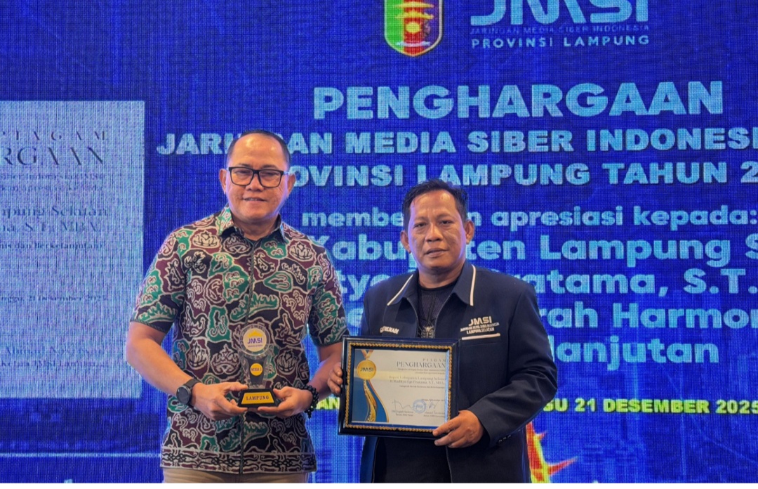 Penghargaan tersebut diserahkan langsung oleh Ketum JMSI, Teguh Santosa pada Musyawarah Daerah (Musda) II JMSI Lampung, “Pers Sehat, Profesional Menuju Indonesia Emas, di Bandar Lampung, Minggu (21/12/25).